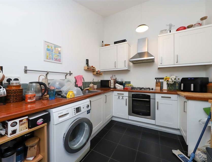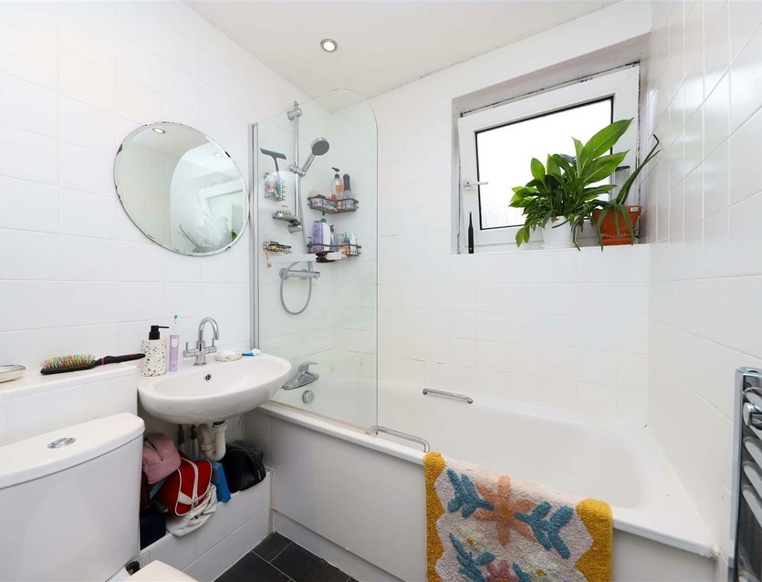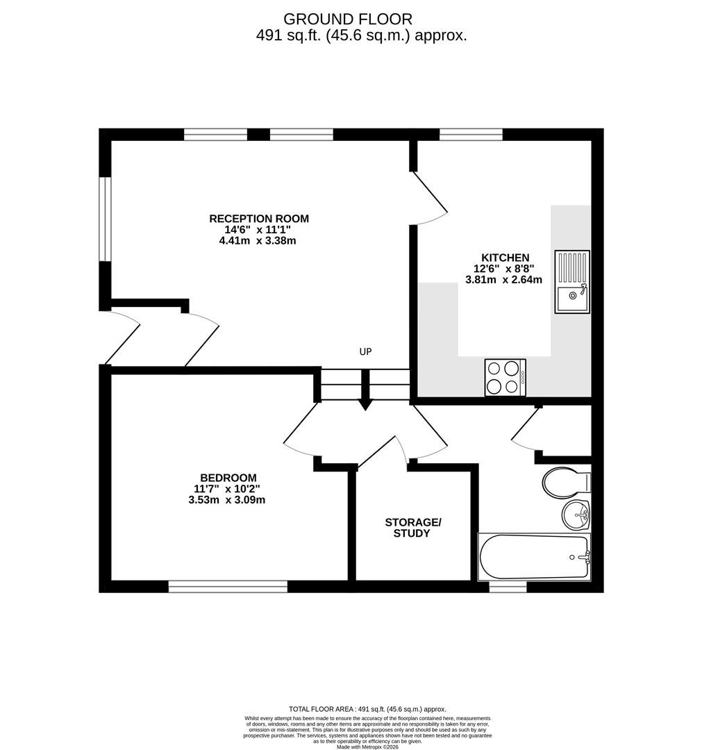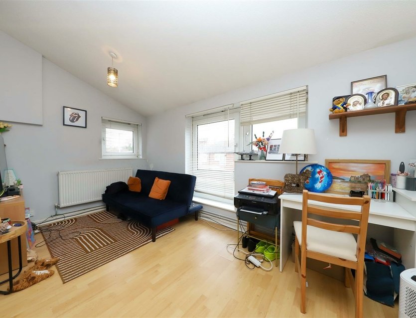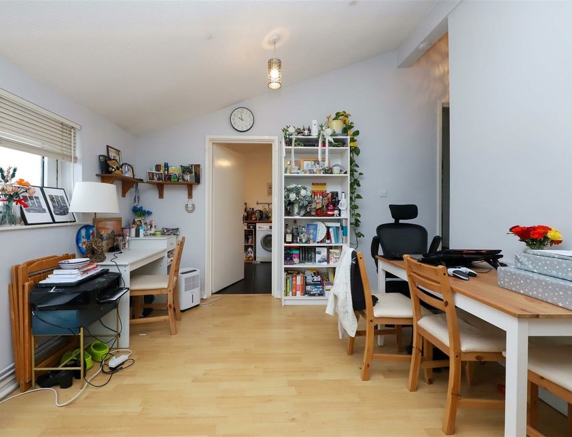 The property comprises 491 sq ft of well-arranged first floor accommodation. To the front, a bright reception room offers comfortable living space with good natural light. The kitchen to the rear provides space for large worktop surfaces and appliances. The property also includes a double bedroom, a versatile storage or study room suitable for home working, and a bathroom fitted with a bath with shower attachment, wash basin and WC.