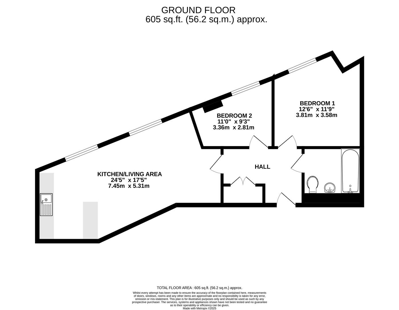 The accommodation includes an entrance hall with built-in storage, a contemporary bathroom, two bedrooms, and an open-plan living area featuring fitted kitchen units and integrated appliances.