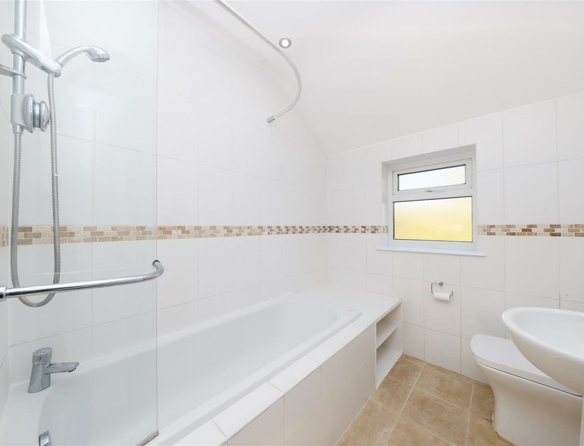 On the first floor, the landing provides access to the loft space. The generous primary bedroom includes built-in wardrobes and a front-facing double-glazed window. Bedroom two is also a spacious double with bespoke built-in storage and a rear-facing double-glazed window overlooking the garden. The modern, fully tiled bathroom includes an enclosed bath with shower over, wash basin, WC, and a rear-facing double-glazed window.