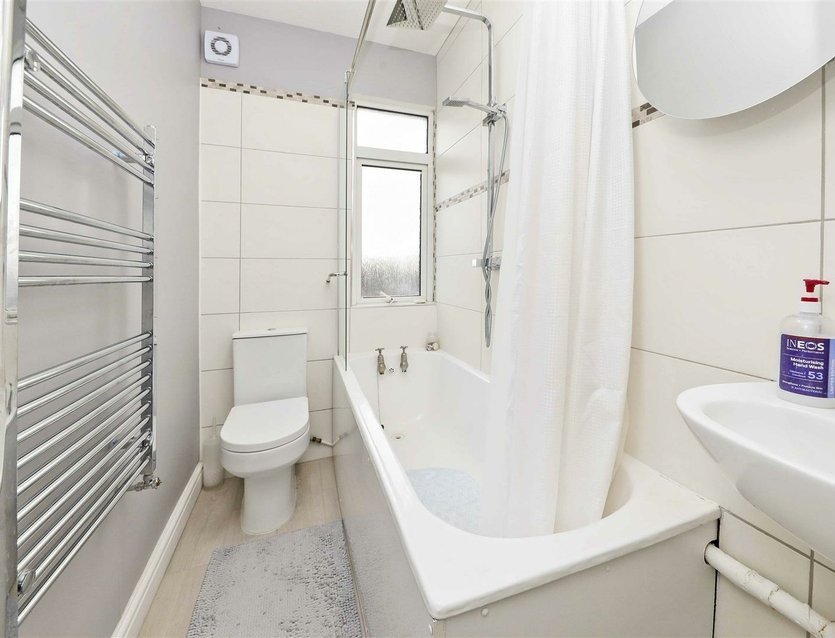 The bathroom is fitted with a cast iron bath with shower over, wash basin, and WC, complemented by partly tiled walls and a rear-aspect double-glazed window.