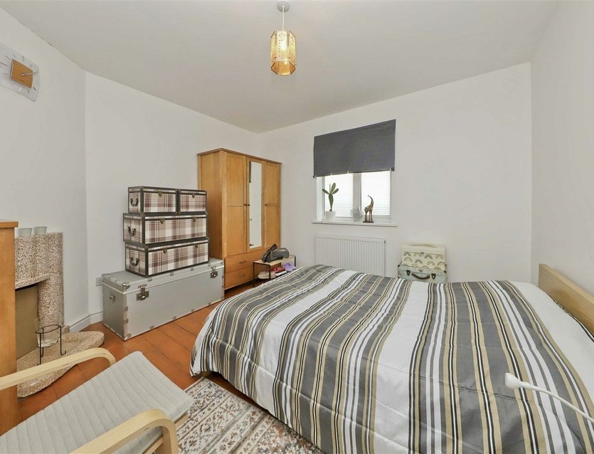 The primary bedroom is generously sized, enjoying a large front-aspect window and wooden flooring. The second bedroom overlooks the rear and also features wooden flooring, a double-glazed window, and a tiled feature fireplace.