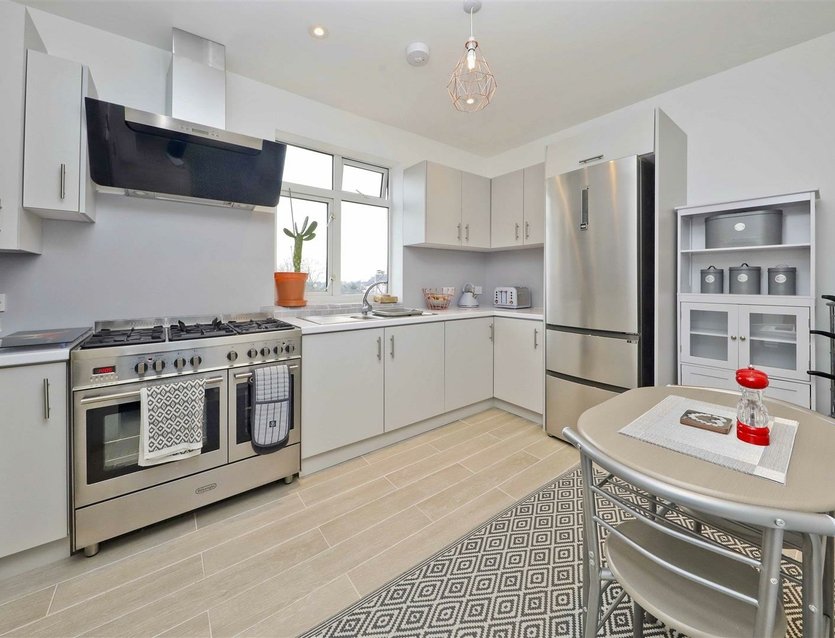 The living room is bright and spacious, featuring a large front-aspect double-glazed window and attractive wooden flooring. The modern kitchen is well appointed with a comprehensive range of fitted storage units and drawers, ample work surfaces with an inset sink, space for a range cooker with extractor hood above, and provisions for a fridge freezer and washing machine. A rear-aspect double-glazed window and tiled flooring complete the space.