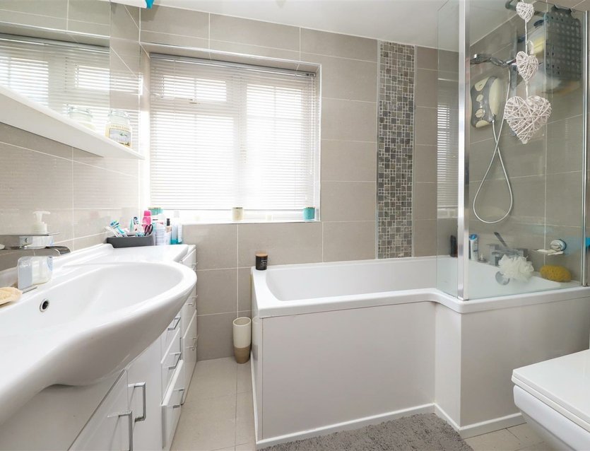 To the first floor, there are three bedrooms, including a generous principal bedroom which benefits from a built-in wardrobe. The family bathroom is well-appointed and fully tiled with an enclosed bath, vanity wash basin, and WC.