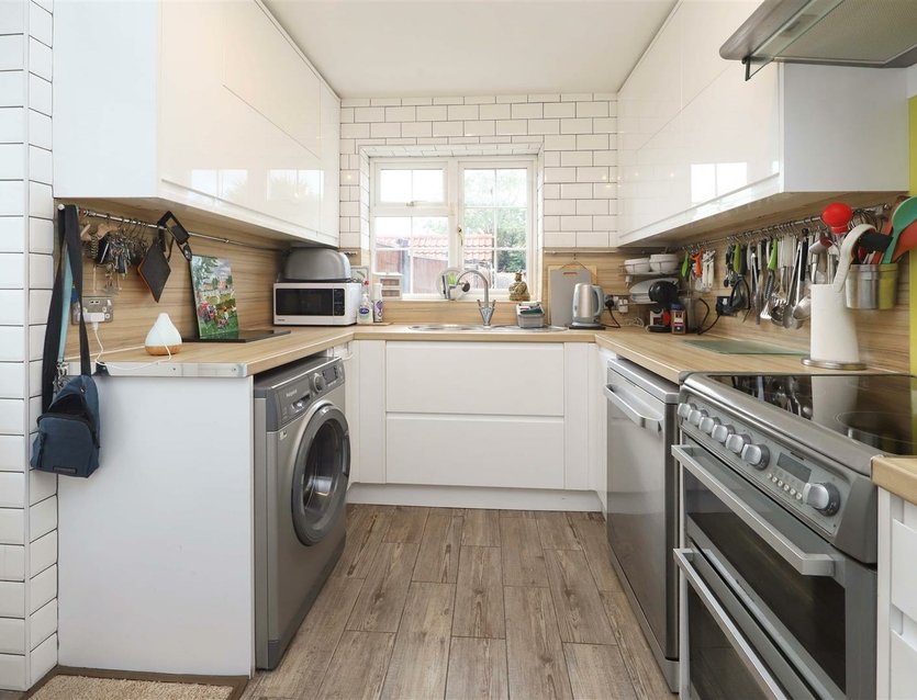 The accommodation briefly comprises an entrance hall with stairs to the first floor and a ground floor WC. The large, open-plan living and dining area offers a superb, family-friendly space that opens onto the rear garden. The kitchen is well-appointed with an excellent range of storage units and drawers, with space for a dishwasher, washing machine and electric oven with extractor hood above. Ample work surfaces have an inset sink and a double glazed door opens to the side of the property.