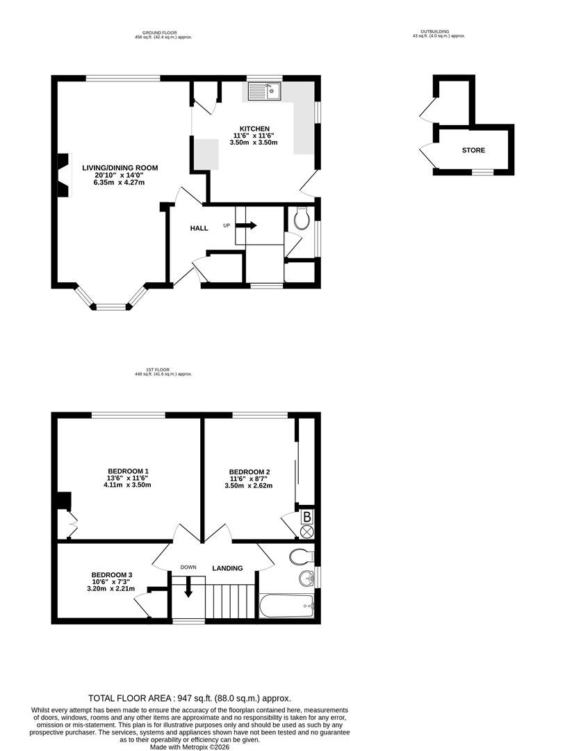 The house is arranged over two floors and extends to approximately 947 sq ft. On the ground floor, a generous living/dining room runs the full depth of the property, with a bay window to the front and ample space for both seating and a dining area. The kitchen sits to the rear and is well proportioned, with clear potential to reconfigure or open out, depending on preference. A central hallway and ground floor WC complete the layout.