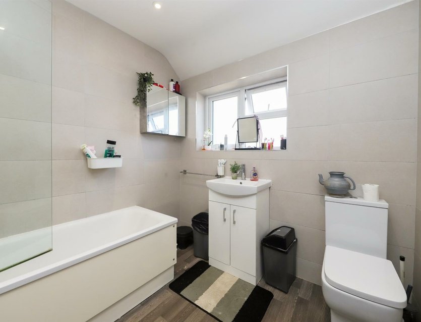 On the first floor, there are three well-proportioned bedrooms and a tiled family bathroom, comprising an enclosed bath with shower over, a wash basin with storage below, and a separate WC.