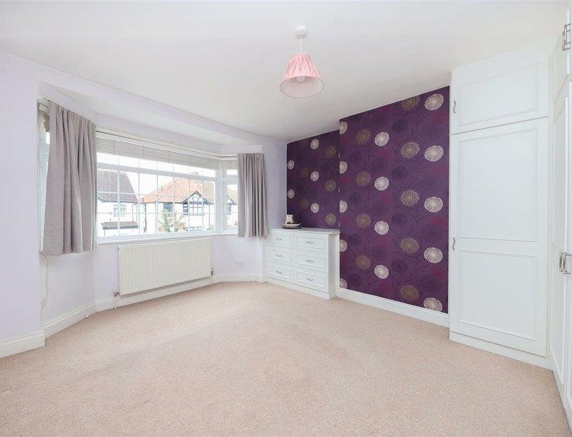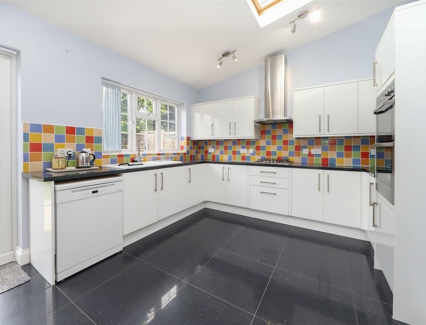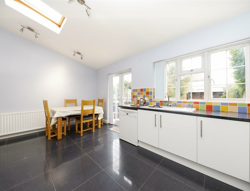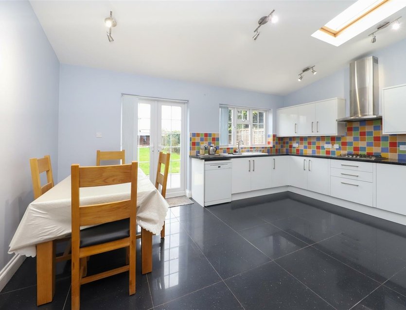 The open-plan reception room is a particular feature of the home, boasting a charming fireplace with marble surround and a front-facing bay window that allows for plenty of natural light. The dining area flows seamlessly into the extended kitchen/breakfast room, which is well appointed with a generous range of fitted units and drawers, complemented by ample work surfaces. There is an inset gas hob with extractor hood over, an integrated double oven, and space for a dishwasher. Double doors provide views over and direct access to the rear garden.