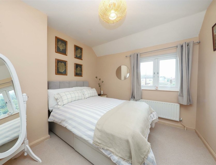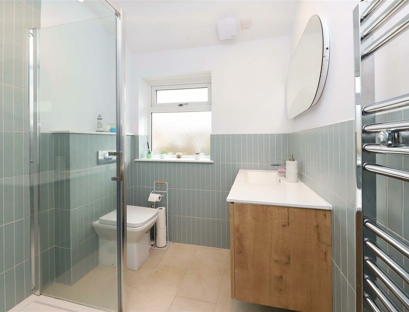 To the first floor, the landing provides access to the loft space. The generous principal bedroom enjoys a front-facing double-glazed window. Bedroom two is a spacious double room with a rear-facing double-glazed window overlooking the garden, while bedroom three is a well-proportioned single room, also with a rear-facing double-glazed window. The modern shower room is fitted with an enclosed shower cubicle, vanity wash basin, WC, and a front-facing double-glazed window.