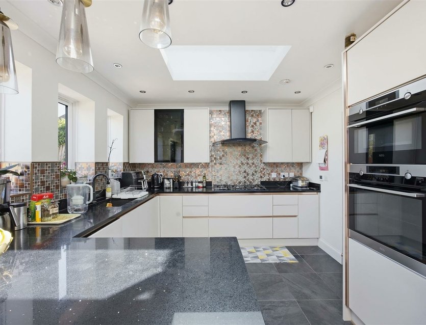This superb space is fitted with a range of stylish modern units and drawers, offering ample storage, alongside integrated appliances including a dishwasher, built-in oven, and microwave, with additional space for a washing machine. Granite work surfaces provide generous preparation space and incorporate a breakfast bar, as well as an inset five-ring gas hob with extractor hood above. Tiled flooring with underfloor heating runs throughout, while bi-fold doors open onto and overlook the rear garden, allowing for an abundance of natural light.