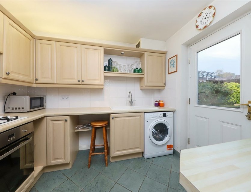 The kitchen is fitted with a range of wall and base units with complementary work surfaces, an inset gas hob with an electric oven below and extractor hood above, and space for appliances. A double-glazed door provides access to the rear garden.