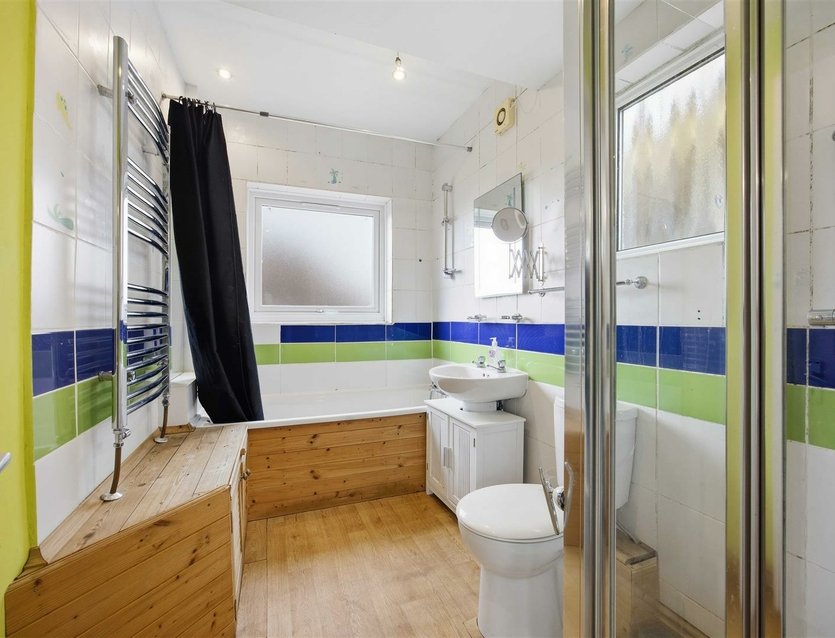 The bathroom comprises an enclosed bath, separate shower cubicle, wash hand basin, WC and a double glazed window to the rear.