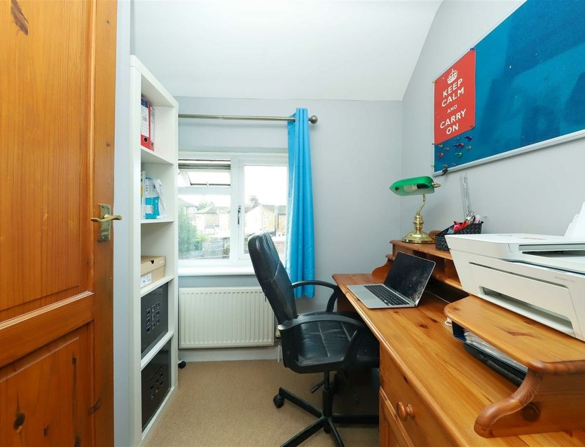 To the first floor are four spacious bedrooms, with the principal bedroom benefiting from an en-suite shower room, along with a separate study. The family bathroom comprises an enclosed bath with shower over, vanity wash basin and WC.