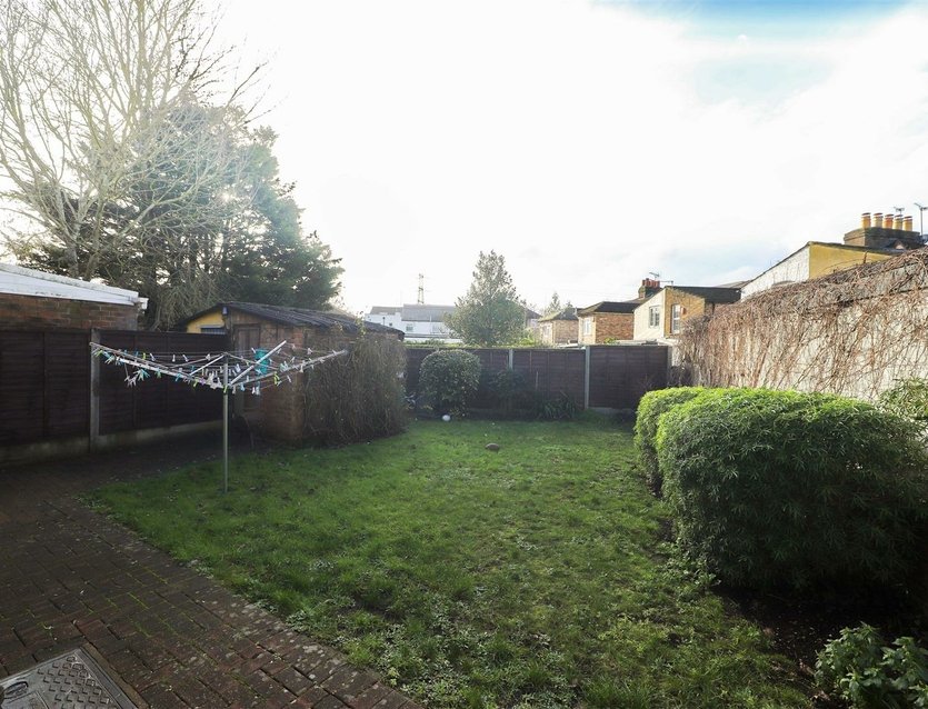 The property features a private rear garden, mainly laid to lawn with mature shrubs, a block-paved patio area, and a pathway leading to the garden shed. Side access provides convenient access to the front of the property.